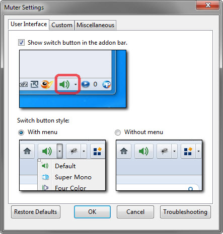 Ici, il est possible de passer à un bouton sans menu (thème par défaut), ou basculer sur un bouton avec menu avec la possibilité de personnaliser le thème utilisé dans le navigateur et de changer le raccourci clavier. Vous pouvez également activer ou désactiver le son de Firefox avec le raccourci Ctrl-Alt-M. Cela peut être utile si vous préférez ne pas avoir l’icône de l’extension affichée dans la barre d’état du navigateur.