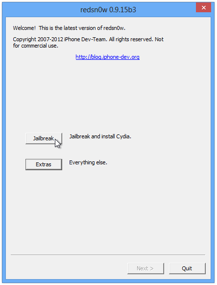 Comme nous l’avons mentionné précédemment, il s’agit d’un jailbreak « tethered », ce qui signifie que vous devez éteindre votre appareil iOS, le connecter à votre ordinateur et le booter en utilisant Redsn0w. Pour ce faire, connectez votre appareil en hors tension sur votre ordinateur via un câble USB; lancez Redsn0w et allez dans Extras et cliquez sur ‘booter’ ou « Just Boot ».